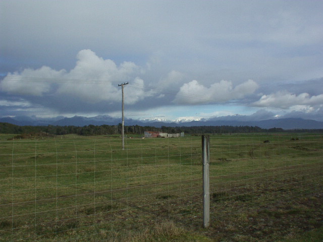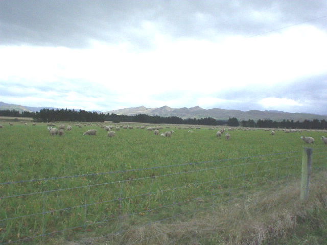 across flat green plains, with sheep, backed by brown winter swept hills,
